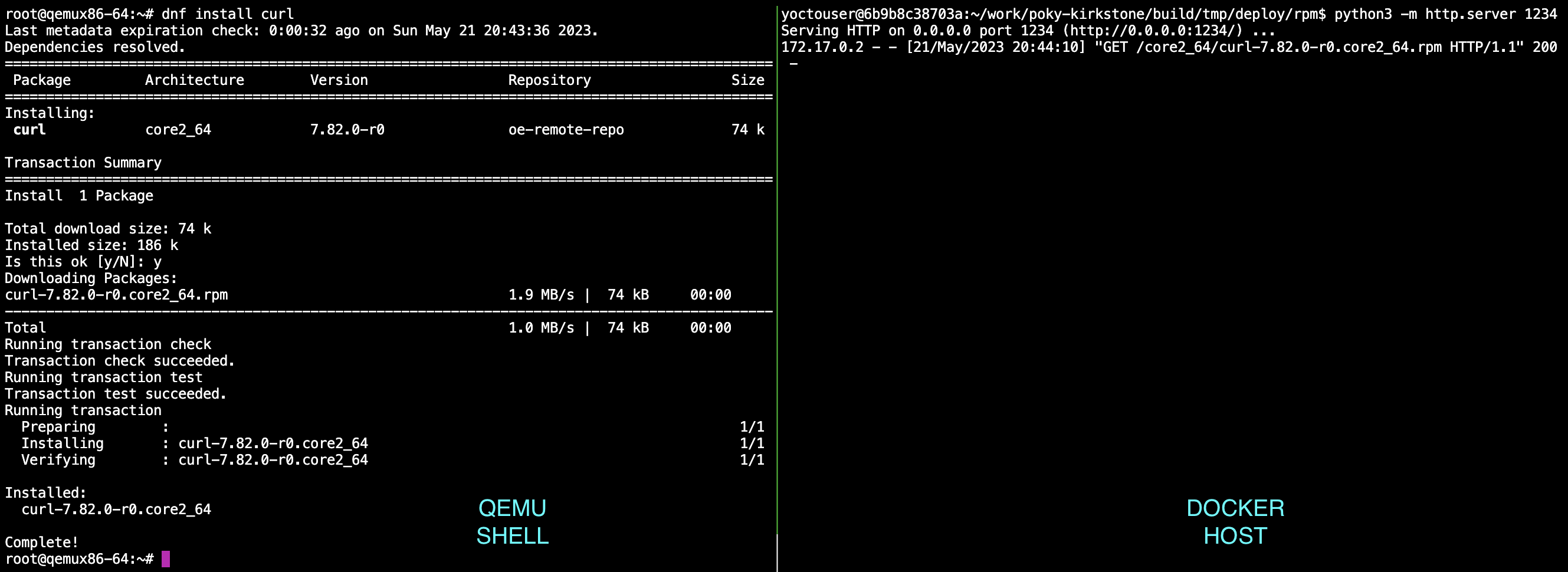 https://www.yocto.co.kr/189 글에서 PACKAGE_FEED에 대한 것을 설명했는데 아래와 같이 설정하고 빌드한 후 dnf를 qemu shell 내에서 실행하면 docker host에 있는 PACKAGE FEED 웹서버에 접속하여 소스를 받아올 수 있다.